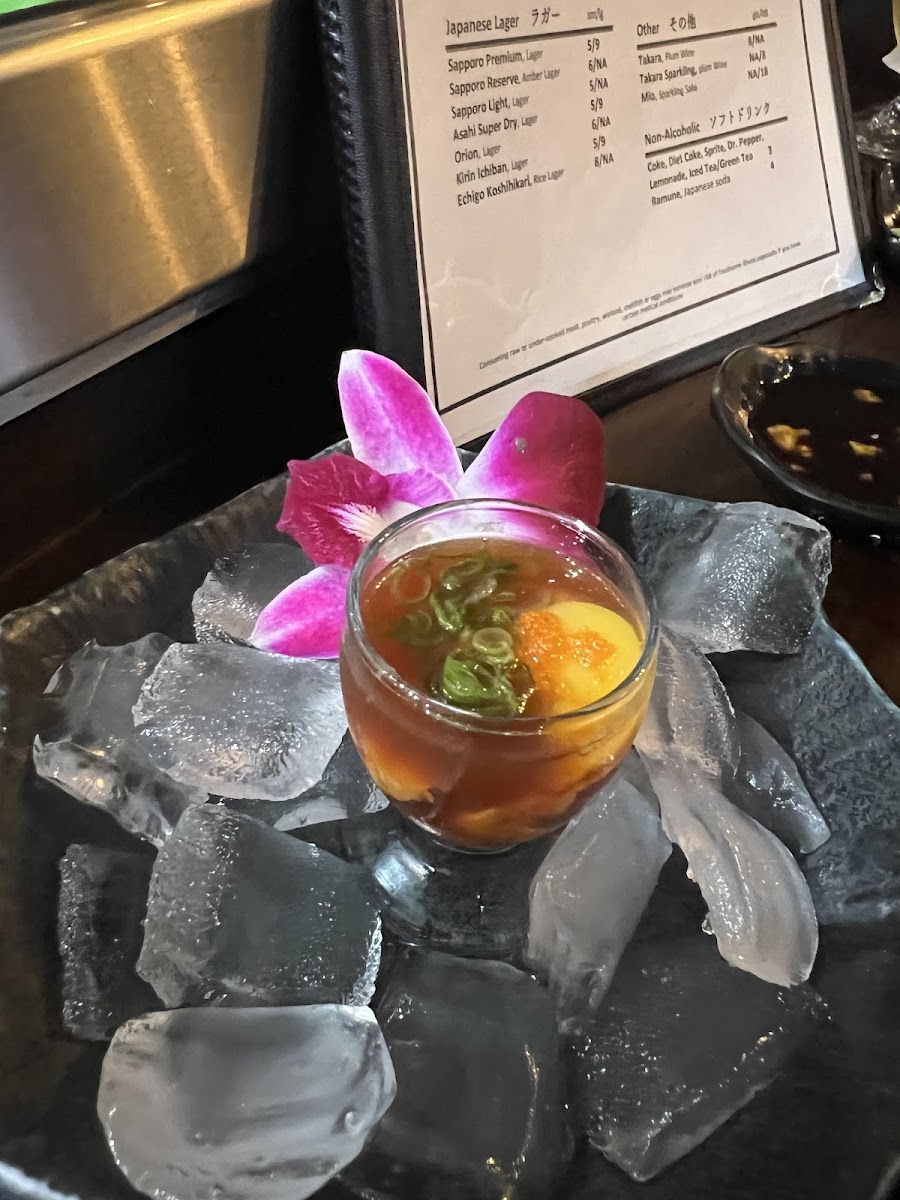 inside: California roll outside, tataki sashimi on top with bits of fresh wasabi and garlic chips, onion ponzu, 8pcs